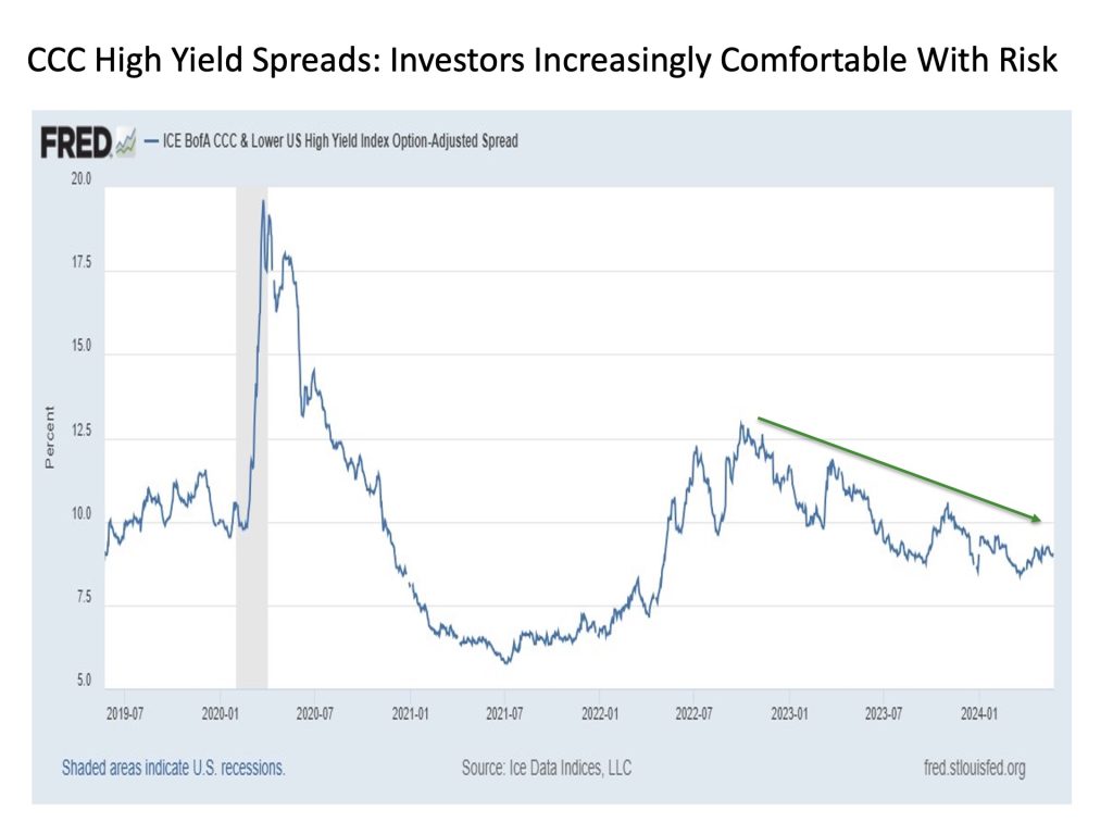Risk appetite. A variety of indicators suggest that investor risk appetites remain alive and well. Among the many indicators supporting this notion is CCC and lower rated corporate bond spreads over comparably dated U.S. Treasuries, which is shown in the chart below.