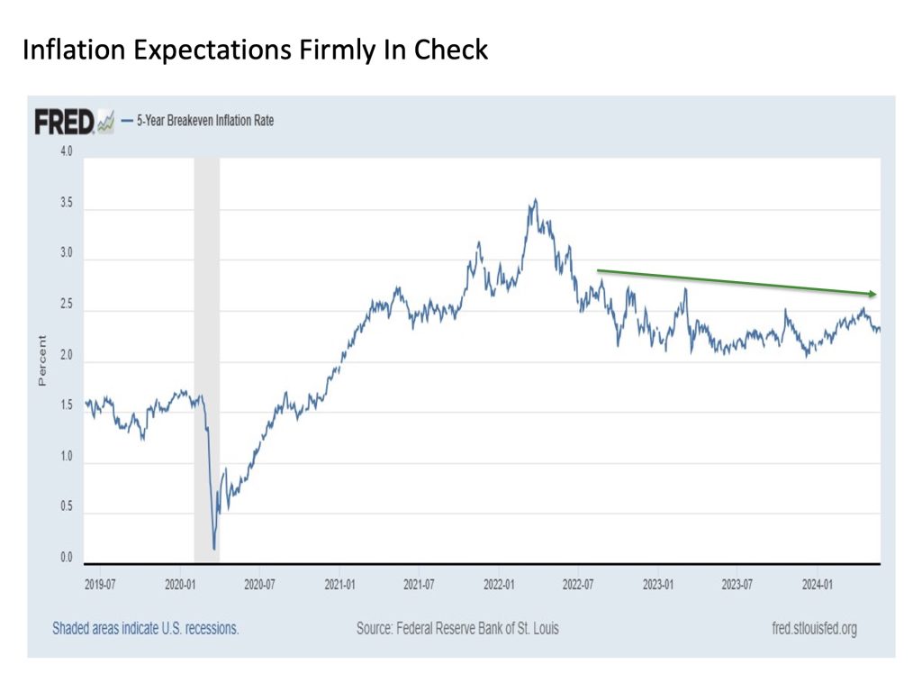 Inflation in check. Despite all of the fuss about stronger than expected inflation readings throughout the early months of 2024, U.S. stock prices have shaken off these concerns in marching higher. So if the recent development of cooler than expected inflation starts to become a trend into the summer, this could unleash U.S. stock prices even more. And if inflation expectations are any sign, the long-term odds favor more disinflation going forward over a renewed rise in inflation.