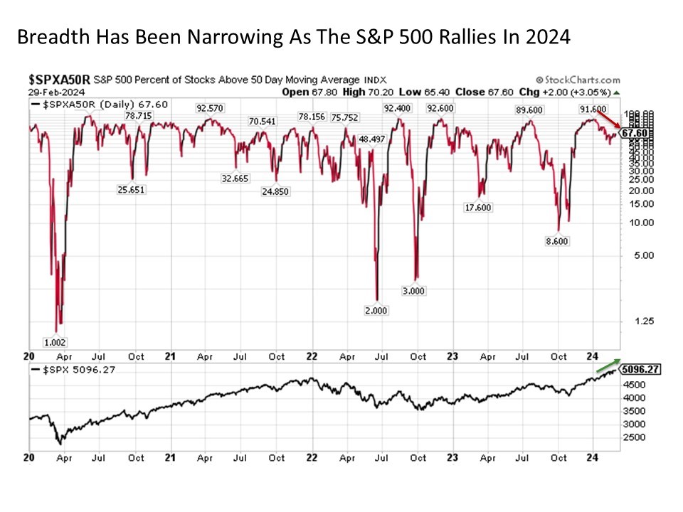 The U.S. stock market is flying once again this year. After posting an impressive +24% advance in 2023, a year when many prognosticators thought that the market would descend further into bear territory instead of skyrocketing, the S&P 500 Index is already up nearly +7% in 2024 so far. But a troubling characteristic continues to linger for the U.S. stock market, which is a notable shortness of breadth in the stocks that are participating in this upside strength. While this remains a downside risk that warrants ongoing attention in the months ahead, it also brings with it some important silver linings.