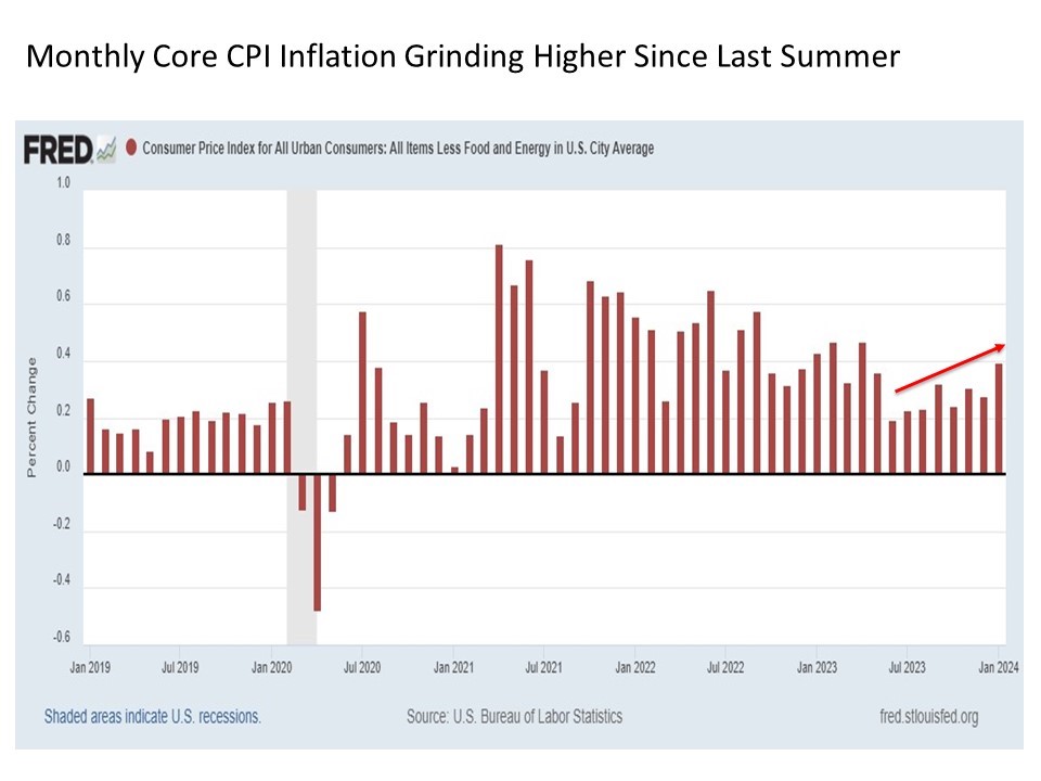 The monthly percentage change in the Core CPI adds to inflation concerns, as this reading has been trending gradually higher since last summer, with the latest reading in January setting a new peak last seen nearly a year ago.