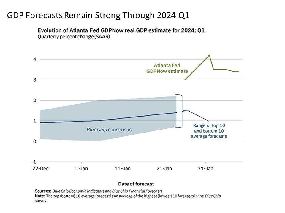 Feel the heat. Nonetheless, it still cannot be denied that the U.S. economy is still running hotter than expected as we move our way through 2024. Many investors were anticipating a slowing of the U.S. economy this year with the possibility of a mild recession unfolding along the way. Instead, we’ve already seen the U.S. economy post a Real GDP growth rate of 3.3% in 2023 Q4 which was much stronger than expected, and current forecasts for 2024 Q1 are for another quarter of strong 3.4% growth according to the Atlanta Fed GDPNow forecast. Economists have been slowly catching up with these projections, just as they did in previous quarters through the second half of 2023.