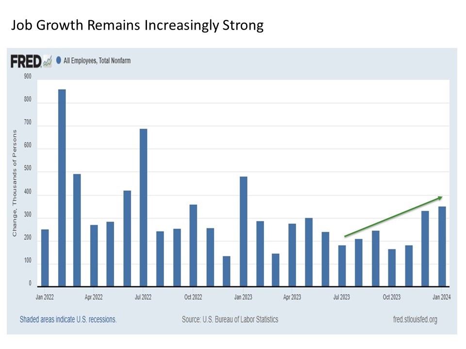 Trends in the employment data are backing up these signals of persistent economic strength. While job growth has been expected to slow as we headed into 2024, we’ve seen the monthly change in total employment in the U.S. steadily accelerate since last summer including the latest reading for January when a strong 353,000 new jobs were estimated to be added to the U.S. economy.