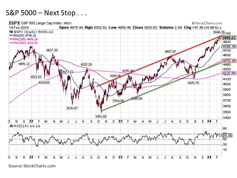 Some like it hot. All of this brings us to an important point to increasingly consider as we continue through 2024. Despite all of these unexpectedly hot economic readings and being overdue for at least a short-term correction, the U.S. stock market as measured by the S&P 500 continues to hover at the high end of its trading range since the October 2022 lows, crossing over 5000 for the first time in its history in recent days. And it may be persisting in setting new highs in 2024 for good reason despite the fading hopes for a wave of liquidity injecting Fed rate cuts this year.