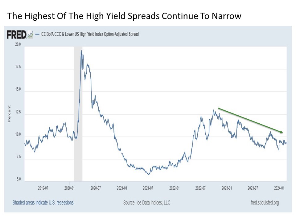 So where do we stand with CCC and lower spreads today? A few years ago, the stress was real, as CCC and lower spreads started widening in July 2021, which was nearly half a year before the stock market finally peaked in early 2022. But since late 2022, CCC and lower spreads have been steadily narrowing. This suggests that investors are becoming increasingly risk tolerant as the rebound from the October 2022 lows continues. And given how tight these spreads were just a few years ago, the potential for further spread tightening remains as we continue through 2024.