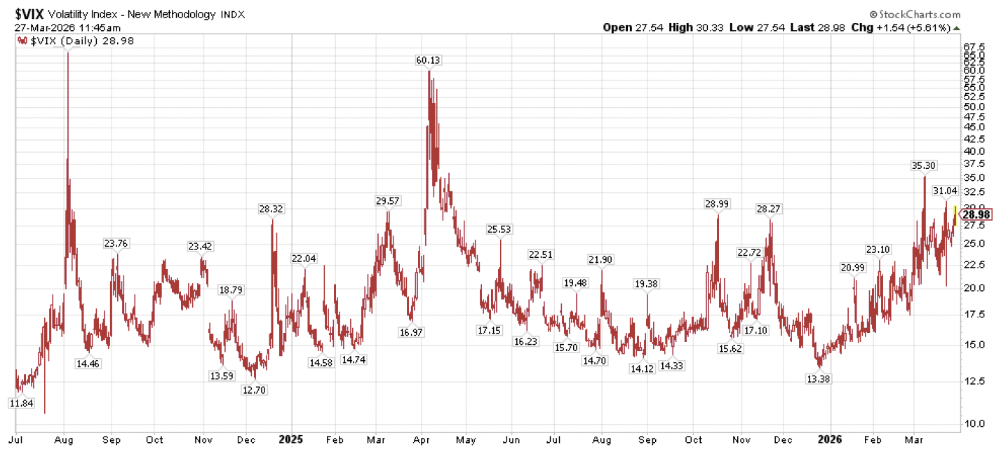 A different look at the market highlights the anxiety investors have been feeling lately.  The CBOE Volatility Index, also known as the VIX as shown in the chart below, is a measure of market “fear” based on the price that investors are willing to pay for options contracts, presumably among other things to buy protection for their long stock portfolios.  Since the sanguine days of the second half of last year where the VIX was trading below 15, we have been moving steadily higher throughout 2026 to readings above 30 in recent weeks.